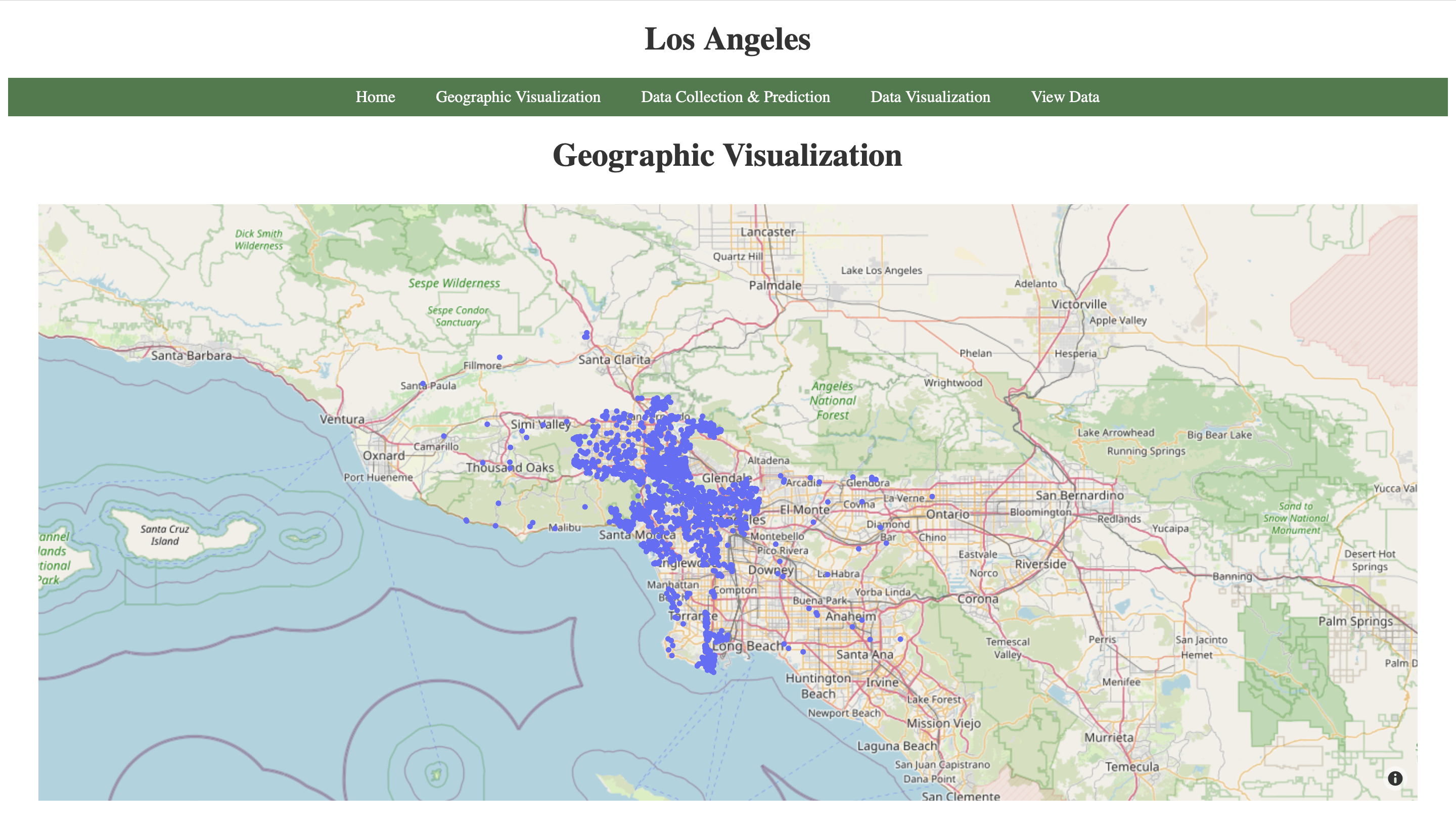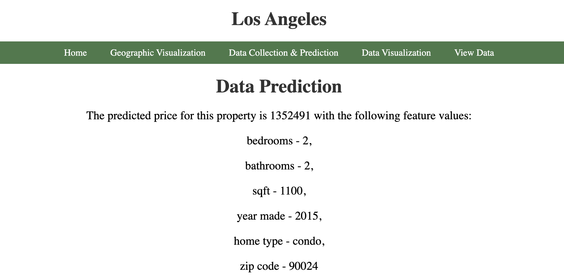 We picked Los Angeles as our target city, and the user is able input data points (number of bedrooms, bathrooms, square feet, year made, home type, and zipcode) through the data collection page. In this particular case, the values 2, 2, 1100, 2015, condo, and 90024 were entered, respectively, and our model was able to predict a price of $1,352,491. Users can play around with the input values to see various predictions.