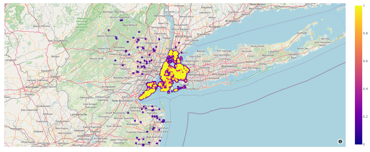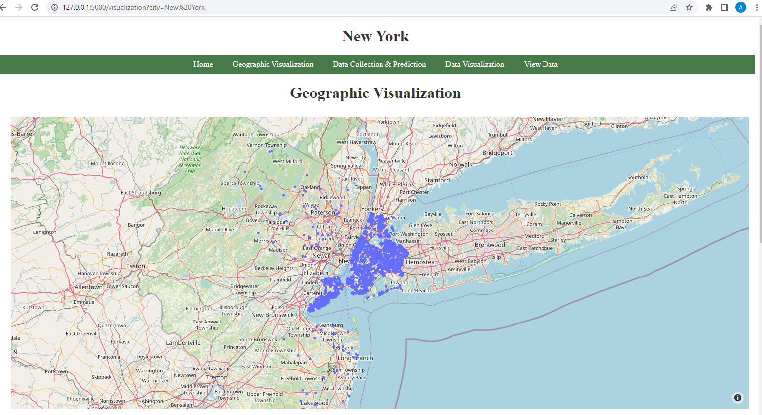 The geographic visualization page contains two graphs utilizing Plotly’s Mapbox platform. The user can navigate to this page by clicking on one of the cities on the home page. This would display the default graphs for the entire data of that city. The first visualization is similar to Zillow’s visualization graph. It provides some valuable insights into the data that has been used to train the model. The user can hover over data points and check out the number of bedrooms, bathrooms, sqft, and home type. The second graph utilizes Plotly’s density Mapbox platform. It shows how dense the data points are in the given region. Here is an example of how the graphs look like for the city of New York.