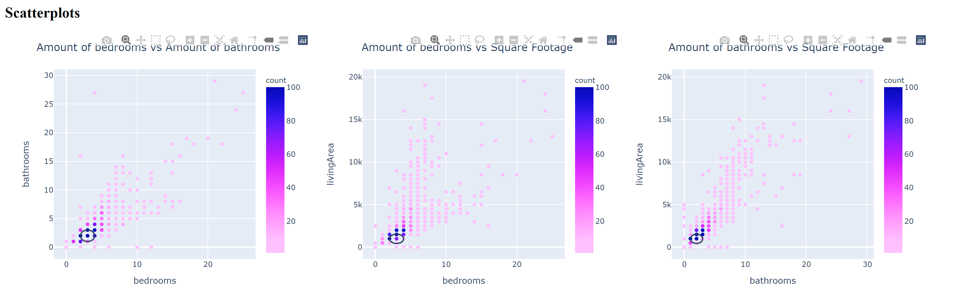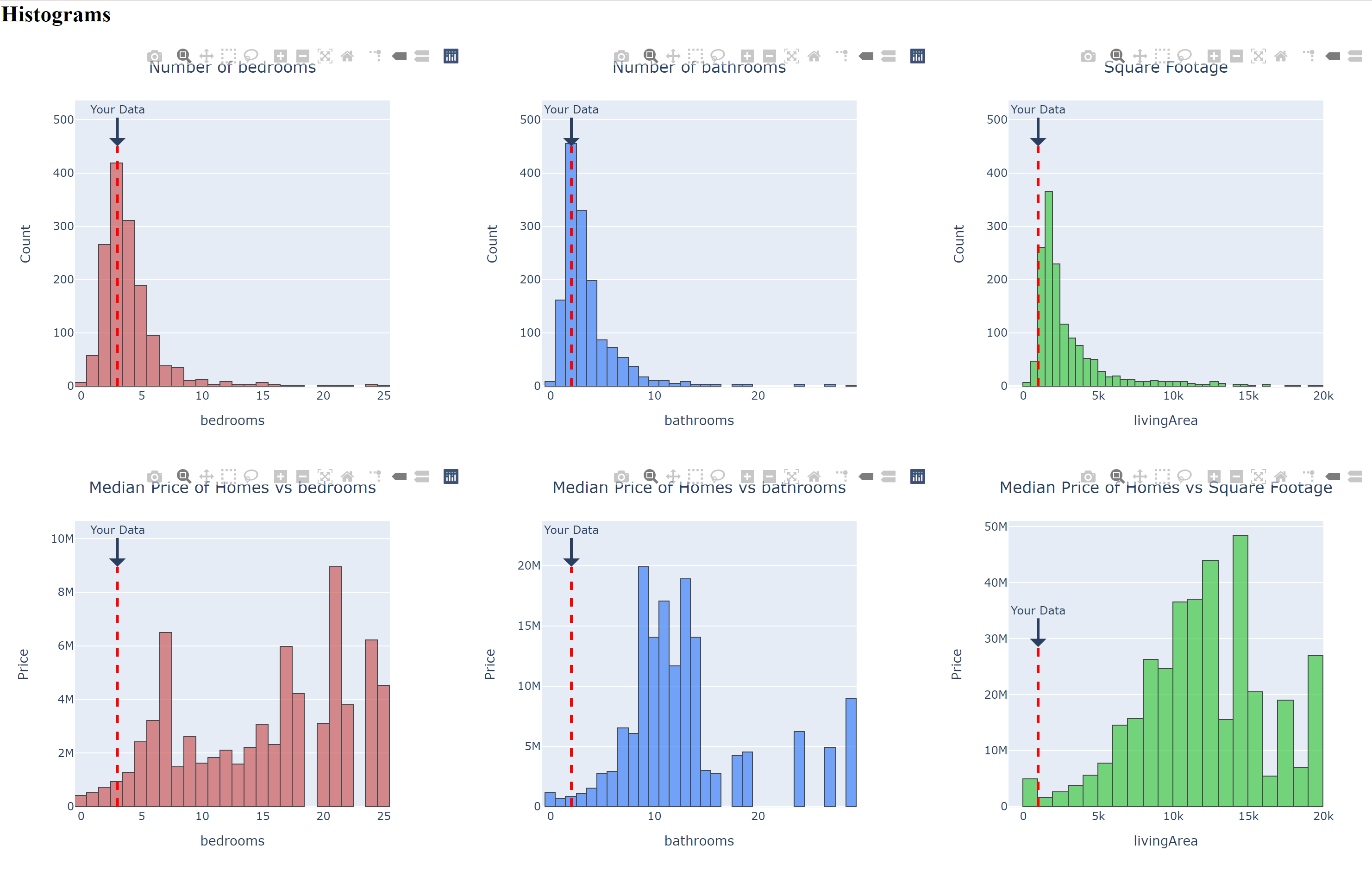 The histogram and scatterplot data visualzation page provides the user with 6 histograms and 3 scatterplots. The purpose of this page was to show where the users home infomration compares to the rest of the housing market. The first three scatter plots show the count of the number of homes compared to bedrooms, bathrooms, and square footage. The next three scatter plots show the median price of homes compared to bedrooms, bathrooms, and square footage. The three histograms show pairwise count plots for the aforementioned features. Once again, these were constructed in plotly.