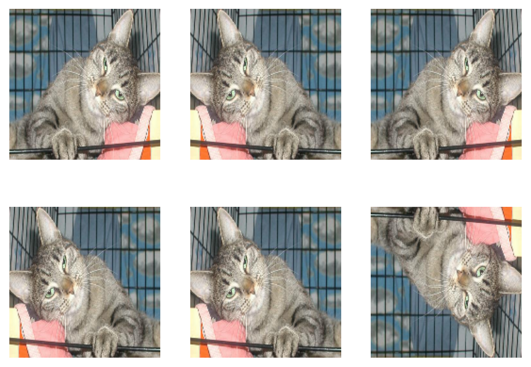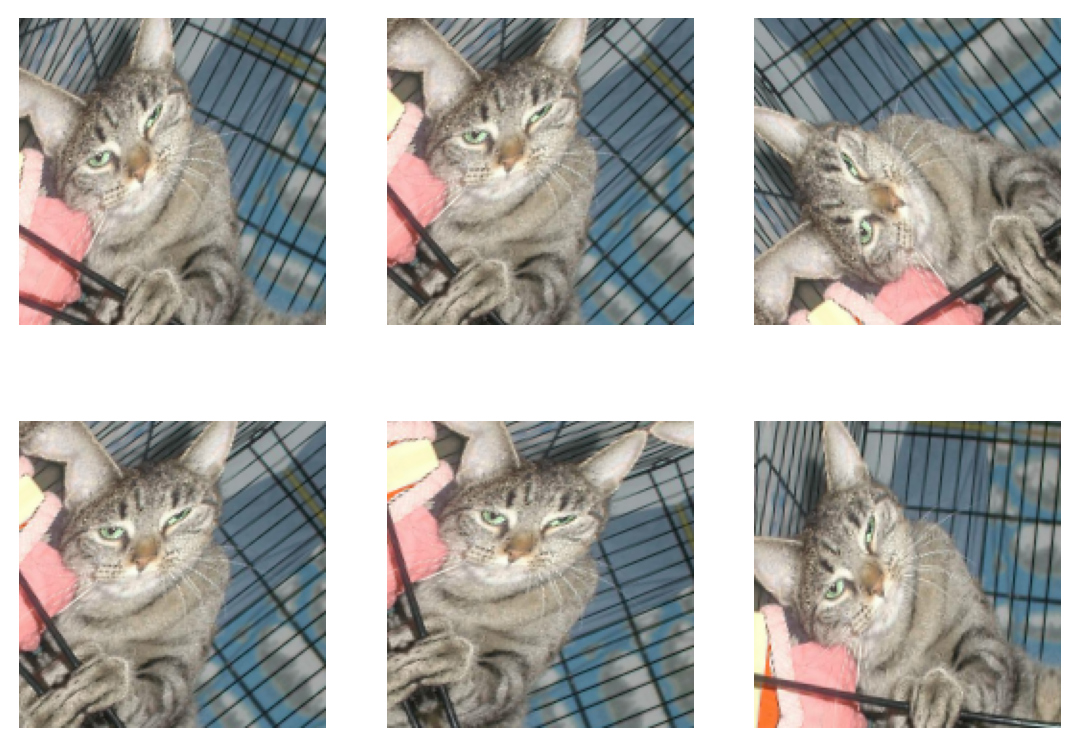 In this model we use data augmentation to avoid overfitting to the training data. We use RandomFlip and RandomRotation layers to make random flips and rotations of the photos. Since the photo of a cat or dog is still a photo of a cat of a dog even if it is fliped or rotated, we benfit from this as now our model is not prone to overfit. Let’s see how these layers work on this photo.