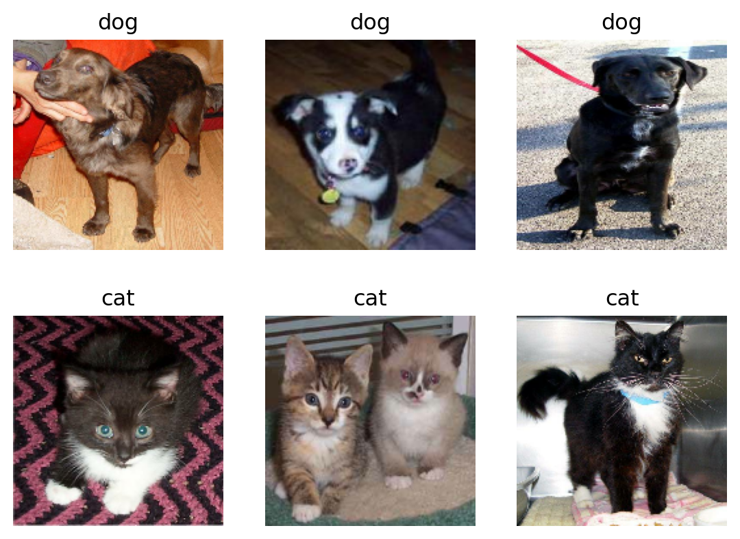 break In order to access a piece of data in the training dataset, we use train_dataset.take(1) function which randomly retrieves one batch of data from the train_dataset. two_row_visualization() function creates a 2 by 3 figure with dog photos on the first row (cause they are better) and cat photos on the second row. Let’s run this function and see how it works.